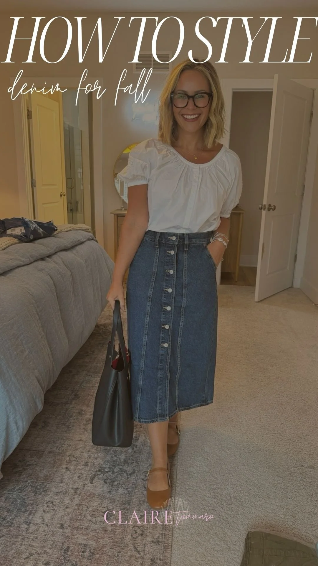 This denim midi skirt is the perfect transition piece for Fall. Pair it with a puff-sleeve top for late Summer or early Fall, and throw on a sweater for colder temperatures.